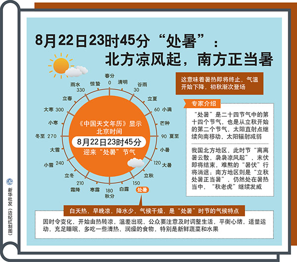 圖表:8月22日23時45分“處暑”:北方涼風起,南方正當暑 新華社發 邊紀紅 制圖