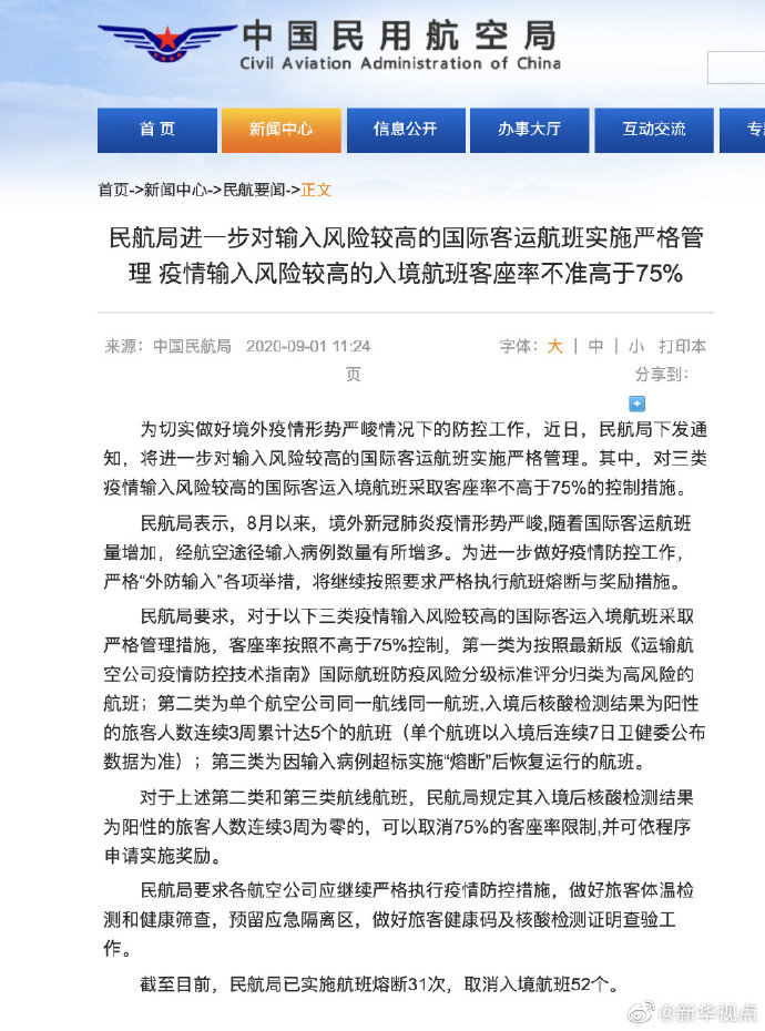 民航局表示,8月以來,境外新冠肺炎疫情形勢嚴(yán)峻,隨著國際客運(yùn)航班量增加,經(jīng)航空途徑輸入病例數(shù)量有所增多。為進(jìn)一步做好疫情防控工作,嚴(yán)格“外防輸入”各項(xiàng)舉措,將繼續(xù)按照要求嚴(yán)格執(zhí)行航班熔斷與獎勵措施。