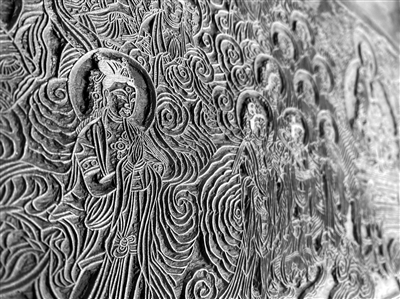 隨著白富鋼的五指輕盈地在古老的木板上游走,一塊木質(zhì)經(jīng)板上縱橫的紋理逐漸明晰起來(lái)。這批經(jīng)板始刻于清雍正十一年(公元1733年),完成于清乾隆三年(公元1738年),是我國(guó)漢文大藏經(jīng)卷帙中收錄最豐富,也是最后一部官方雕印本。經(jīng)板共計(jì)79036塊,總重達(dá)400噸??胺Q我國(guó)木板經(jīng)書(shū)之最。
