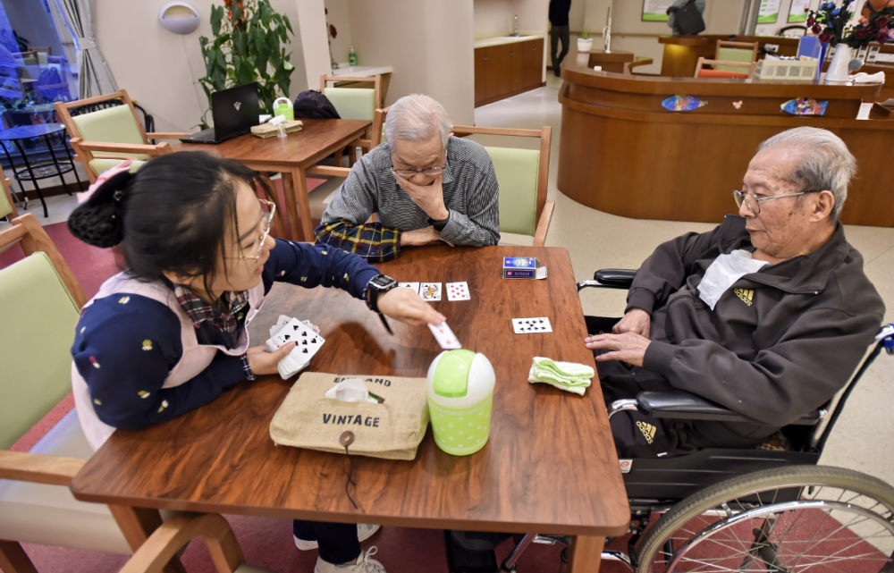 北京市豐臺(tái)區(qū)新村街道社區(qū)養(yǎng)老中心的工作人員在陪老人做游戲(李欣/ 攝)