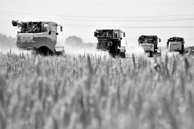 在山東省汶上縣郭倉鎮,收割機在收獲小麥。新華社發