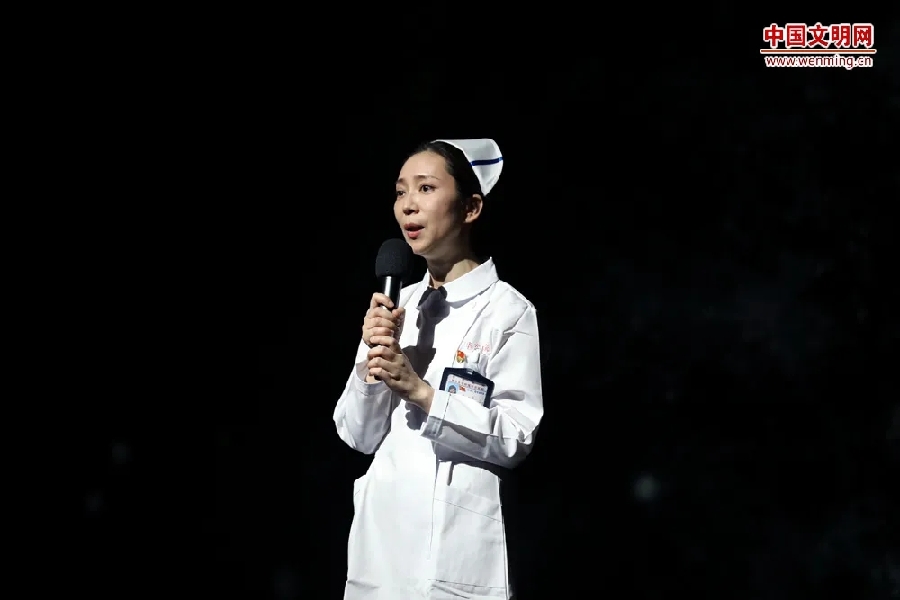 華東醫院外科重癥監護室護士長、上海第一批援鄂醫療隊隊員陳貞現場講述“抗疫”故事。中國文明網 趙洋 攝