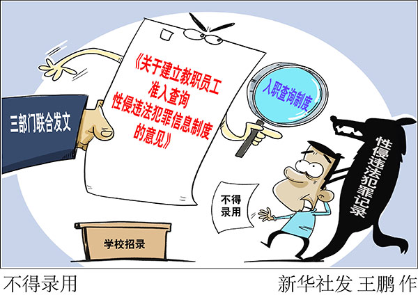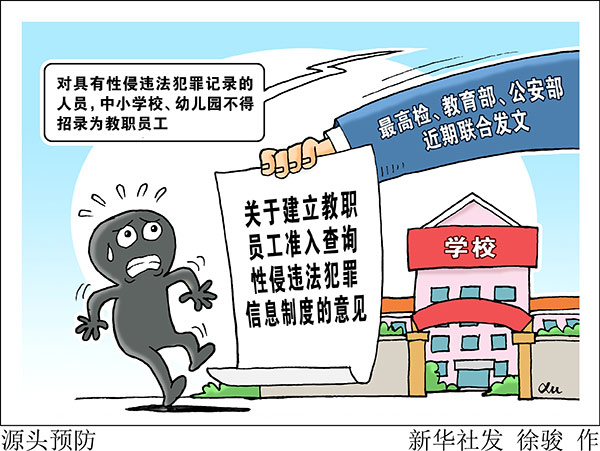 新華社北京9月18日電(記者陳菲)為加強(qiáng)對(duì)性侵未成年人犯罪的源頭預(yù)防,最高檢、教育部、公安部近期聯(lián)合發(fā)文,要求在全國(guó)建立入職查詢(xún)制度,對(duì)具有性侵違法犯罪記錄的人員,中小學(xué)校、幼兒園不得錄用,教師認(rèn)定機(jī)構(gòu)不得認(rèn)定教師資格。