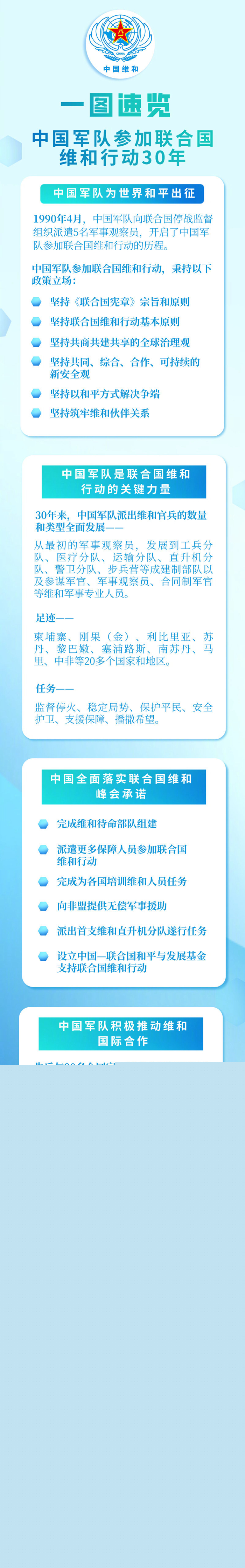 ——積極貢獻中國方案。中國是安理會常任理事國中派出維和軍事人員最多的國家,也是聯合國維和行動第二大出資國。2015年以來,中國軍隊廣泛參與聯合國維和專題審議和政策制定,組織《聯合國維和工兵分隊手冊》《聯合國維和軍事情報手冊》的專家編審國際會議,參加聯合國維和步兵、警衛、航空等多部指導手冊編寫修訂;就聯合國維和行動改革、提高維和行動效能、保障維和人員安全等建言獻策,為維和行動發展貢獻中國方案和中國智慧。