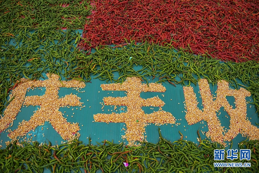 2020年慶祝中國(guó)農(nóng)民豐收節(jié)暨循化縣消費(fèi)扶貧“辣椒節(jié)”上由線辣椒和玉米拼成的慶豐收?qǐng)D案。(新華網(wǎng)潘彬彬攝)