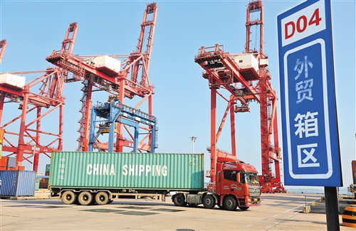 近日,運輸車輛在江蘇連云港集裝箱碼頭轉(zhuǎn)運集裝箱準(zhǔn)備裝船出口國外。 海關(guān)總署發(fā)布的數(shù)據(jù)顯示,今年前8個月,我國貨物貿(mào)易進出口總值20.05萬億元,同比下降0.6%,降幅持續(xù)收窄,接近“轉(zhuǎn)正”。