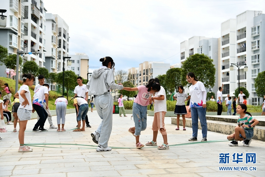 8月13日,在貴州省思南縣雙塘街道麗景社區(qū)易地扶貧搬遷安置點,孩子們和志愿者一起跳皮筋。新華社記者 楊文斌 攝