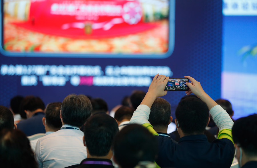 ??? 9月27日,2020中國網(wǎng)絡媒體論壇內容論壇在上海舉行,各界嘉賓圍繞“后疫情時代網(wǎng)絡傳播的‘變’與‘新’”這一主題開展探討和交流。圖為觀眾在論壇現(xiàn)場拍攝。