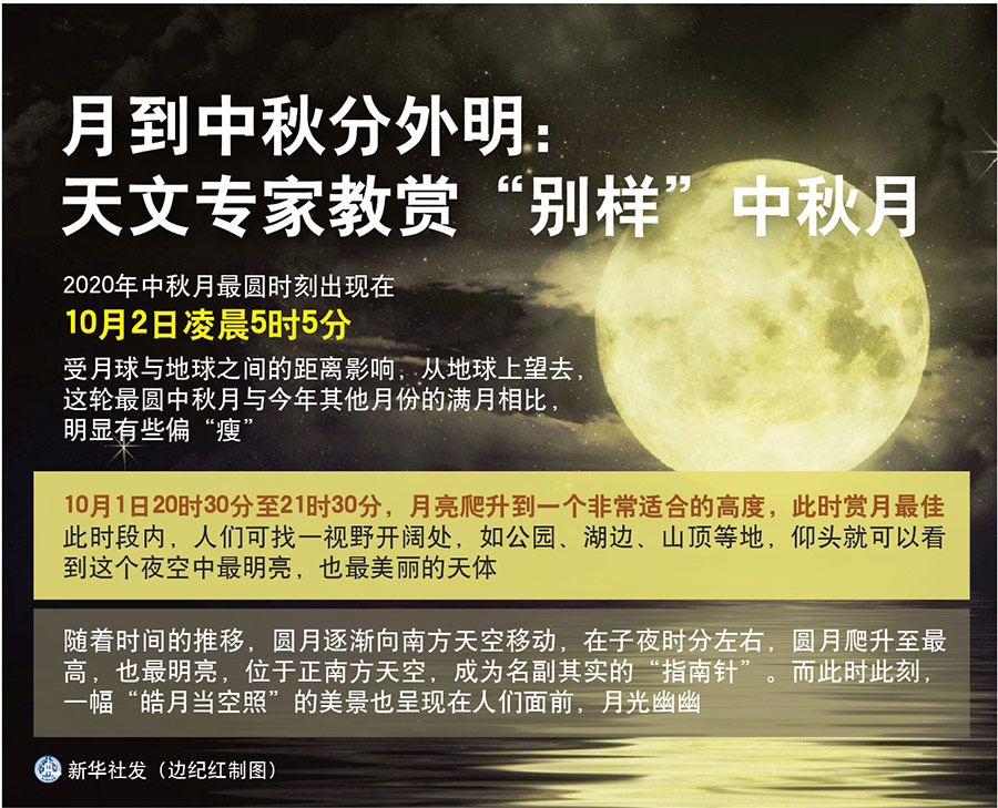 20時30分至21時30分,月亮爬升到一個非常適合的高度,此時賞月最佳。史志成說,此時段內,人們可找一視野開闊處,如公園、湖邊、山頂?shù)鹊兀鲱^就可以看到這個夜空中最明亮,也最美麗的天體。