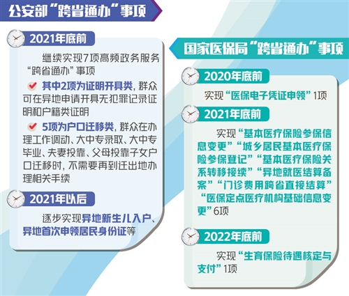 按照《意見》要求,140項高頻事項中,包括市場主體登記注冊、養老保險關系轉移接續等在內的第一批58項“跨省通辦”事項要在2020年底前實現,工業產品生產許可證發證、異地就醫結算備案等74項要在2021年底前實現,后續還將加快實現婚姻登記、社會保險參保繳費記錄查詢等8項事項的異地辦理。