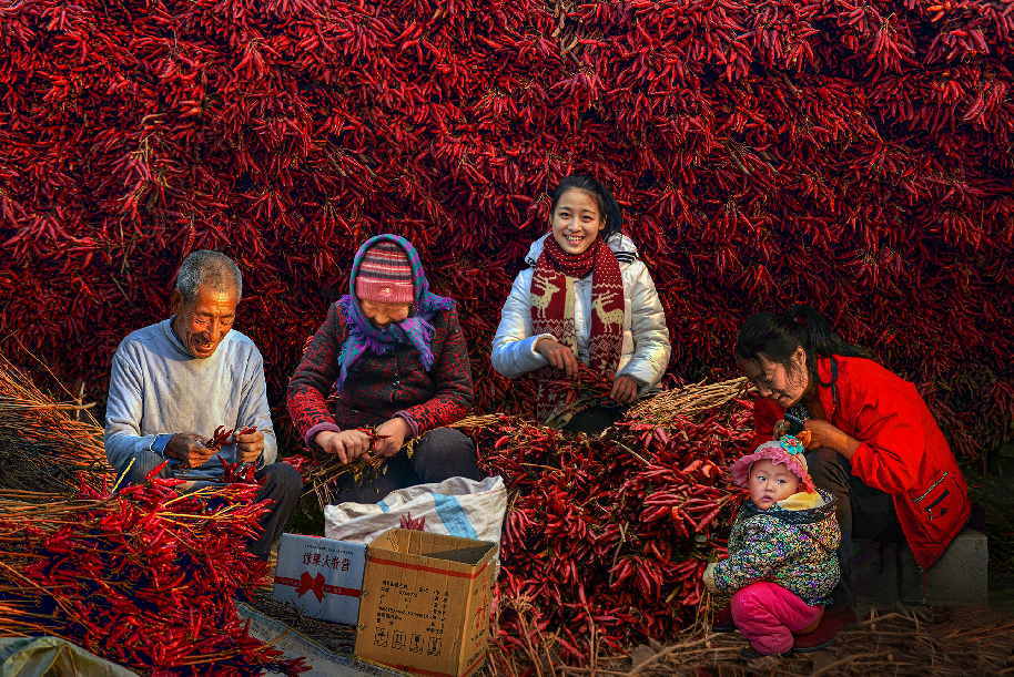 河南省西華縣紅花集鎮周寨村依靠農副業種植打贏扶貧攻堅戰,他們積極開展紅辣椒種植,人均年收入過萬元,日子過得紅紅火火,家家脫貧摘帽向著小康社會邁進!(李偉 攝)