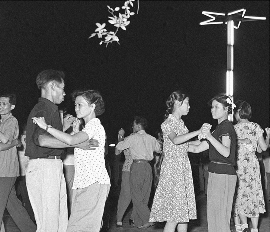 1960年7月15日發(fā),周末之夜,在成都市中心的人民公園里,被“七里香”、薔薇花所繚繞的露天舞池,跳舞愛好者們正在歡舞(新華社記者孫忠靖、黃陸衡/攝)