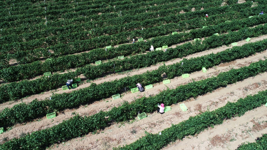 在寧夏銀川市永寧縣閩寧鎮的立蘭酒莊釀酒葡萄種植基地,農戶在田間采摘葡萄(2019年9月3日攝,無人機照片)。新華社記者 王鵬 攝