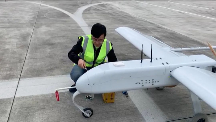 上圖為彭世濤在檢查維修一架用于測繪、航拍的民用無人機。