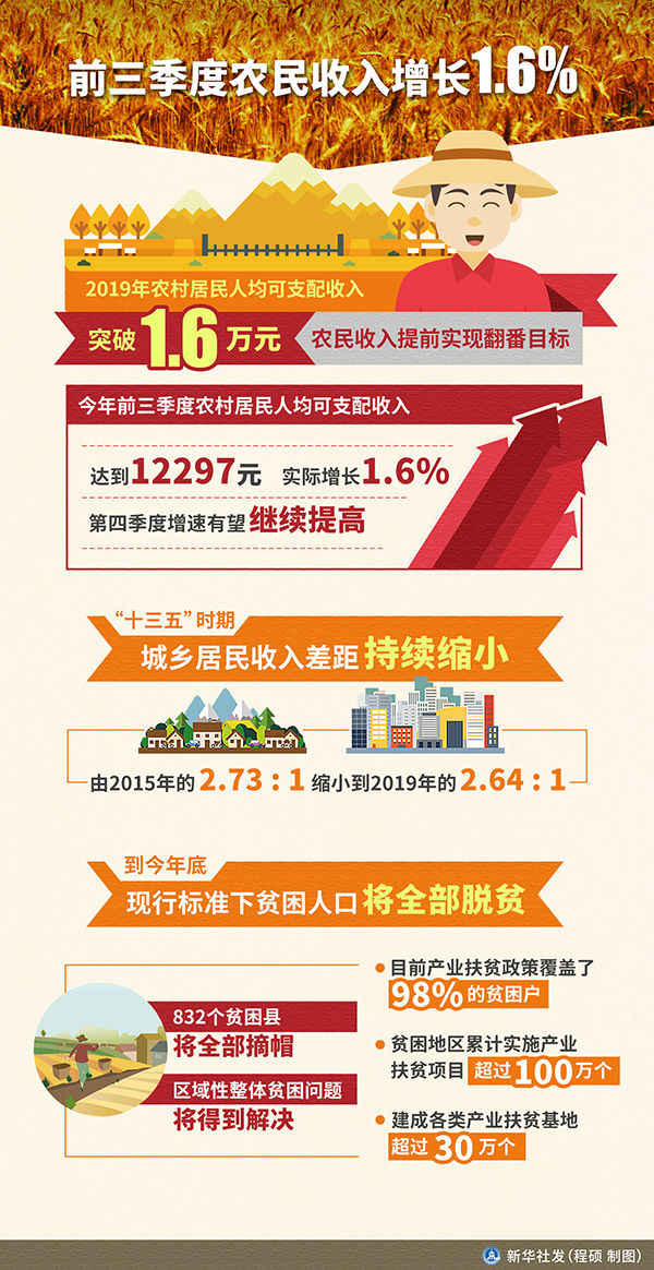 新華社北京10月27日電(記者于文靜)農(nóng)業(yè)農(nóng)村部副部長劉煥鑫27日表示,2019年農(nóng)村居民人均可支配收入突破1.6萬元,農(nóng)民收入提前實現(xiàn)翻番目標(biāo)。今年前三季度農(nóng)村居民人均可支配收入達(dá)到12297元,實際增長1.6%,第四季度增速有望繼續(xù)提高,小康之年農(nóng)民將有更多獲得感。