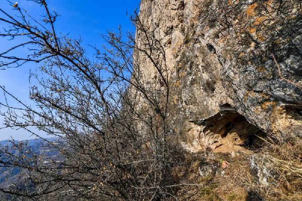 這次路程明顯縮短,但卻十分陡峭。有的路段,我們只能側(cè)著身子,石階僅容一只腳,兩只手只能扒著峭壁,而身后就是懸崖,有時(shí)需要雙腿跪著,慢慢挪動身體。由于沒吃、沒喝,嘴唇干裂起皮,開口說話也有點(diǎn)吃力。這樣攀爬一個(gè)多小時(shí)后,一個(gè)山洞進(jìn)入我們的視野。