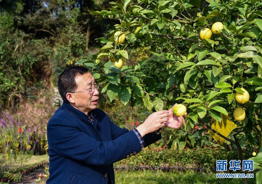在四川省資陽市安岳縣寶森檸檬小鎮世界檸檬品種博覽園,安岳縣檸檬產業發展中心主任田再澤在查看檸檬的長勢情況(11月11日攝)。新華社記者 周相吉 攝