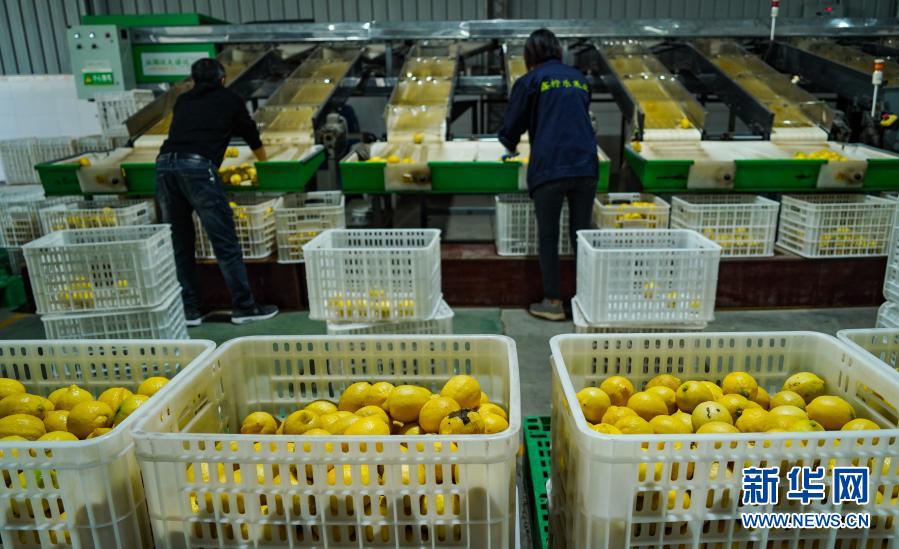 在四川省資陽市安岳縣鑫檸樂果業有限公司車間,工人通過生產線分裝檸檬(11月11日攝)。新華社記者 王曦 攝