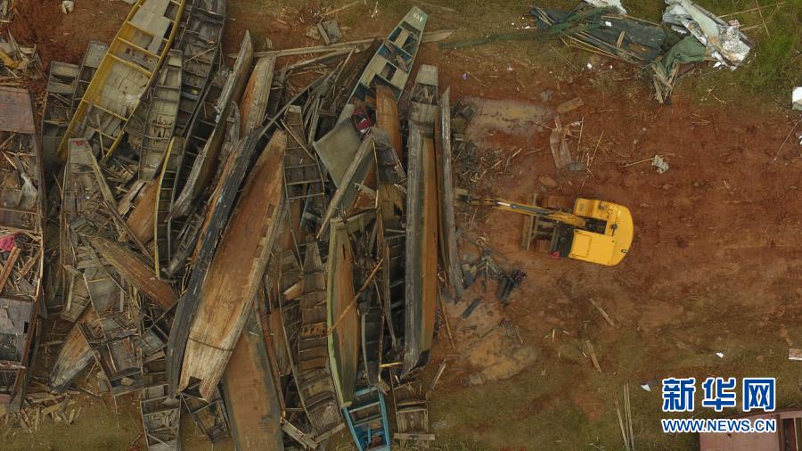 在湖南常德漢壽縣蔣家嘴鎮(zhèn),工作人員在洞庭湖邊駕駛挖掘機拆解漁民上交的漁船(2019年12月17日攝,無人機照片)。新華社記者 薛宇舸 攝