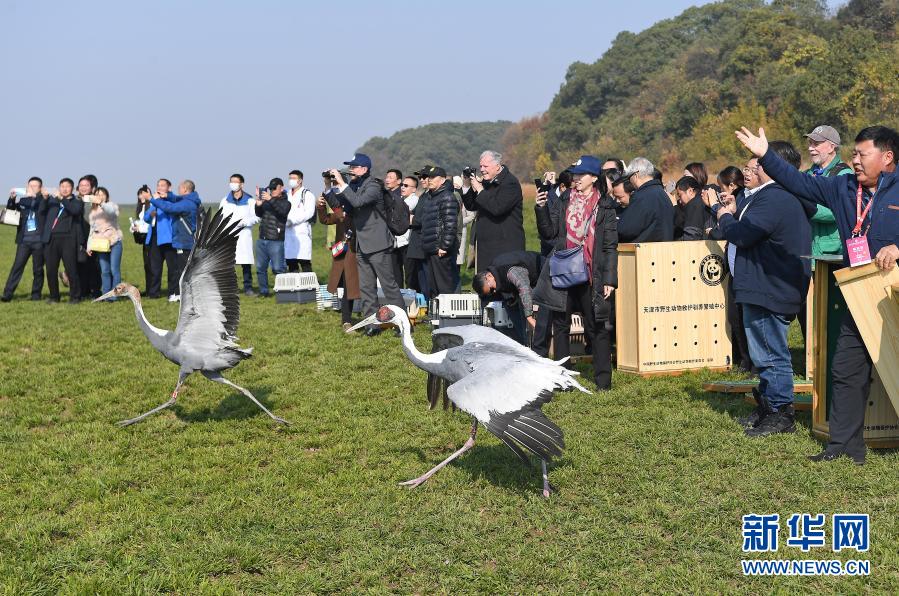 2019年12月8日,國內(nèi)多家野生動物保護機構(gòu)在江西鄱陽湖國家級自然保護區(qū)將120只被救治的珍稀候鳥成功放飛。這是工作人員放飛兩只白枕鶴。新華社記者 萬象 攝