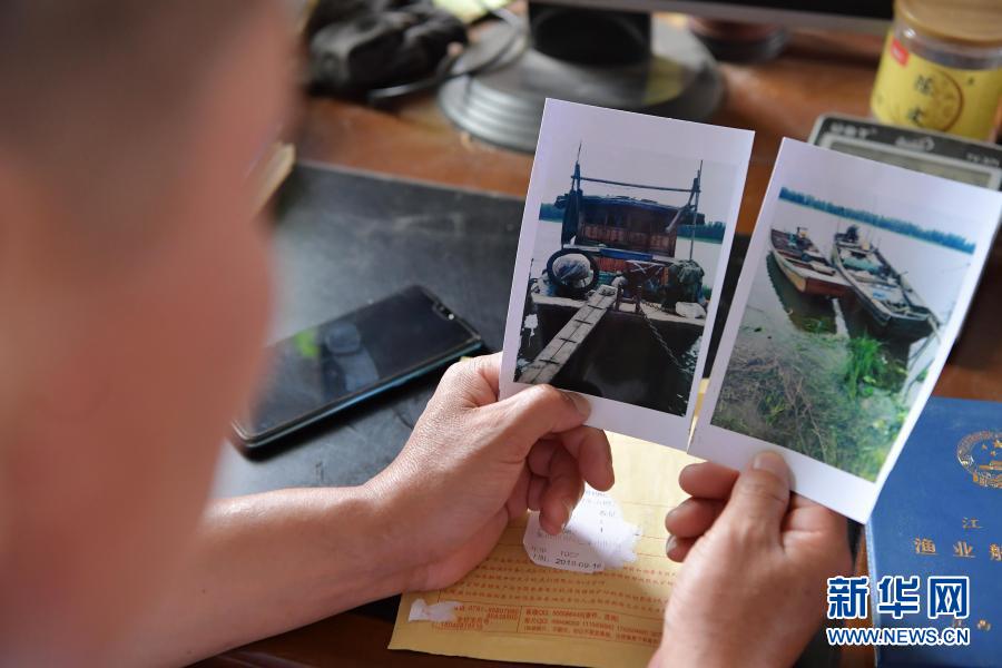 在江西省南昌市新建區(qū)象山鎮(zhèn),上岸漁民吳華山在展示自己珍藏的兩張漁船的照片。這兩條船是吳華山還在當(dāng)漁民時使用的捕撈船只,上岸轉(zhuǎn)業(yè)之后,船只上交,他用領(lǐng)到的補貼開始承包魚塘養(yǎng)殖小龍蝦(6月5日攝)。新華社記者 彭昭之 攝