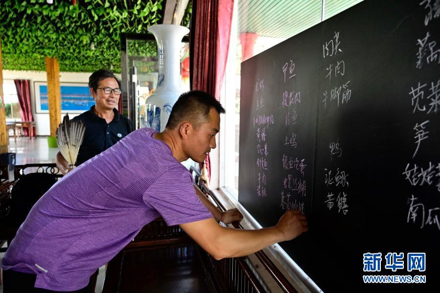 在江西省余干縣田園鄱陽湖景區(qū),上岸漁民朱義才(后)在自己開辦的農(nóng)家樂內(nèi)和兒子一起寫當(dāng)日的菜譜(6月16日攝)。新華社記者 彭昭之 攝