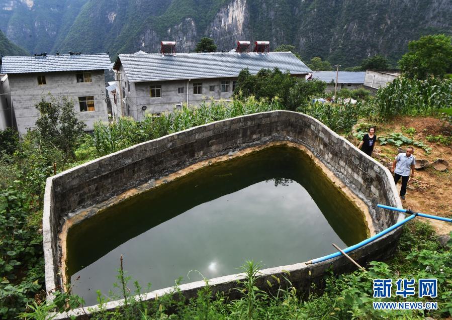 毛相林(前)經過下莊村用于農業生產的水池(2020年7月3日攝)。