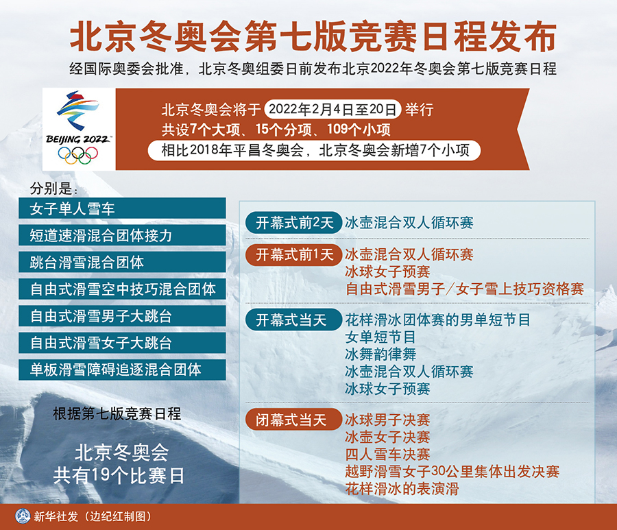 北京冬奧會將于2022年2月4日至20日舉行,共設7個大項、15個分項、109個小項。相比2018年平昌冬奧會,北京冬奧會新增7個小項,分別是:女子單人雪車、短道速滑混合團體接力、跳臺滑雪混合團體、自由式滑雪空中技巧混合團體、自由式滑雪男子大跳臺、自由式滑雪女子大跳臺和單板滑雪障礙追逐混合團體。