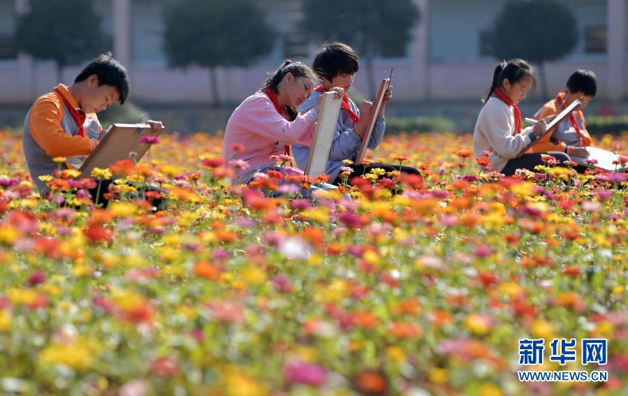 江西省宜春市袁州區寨下中心小學學生在花海上美術課(11月9日攝)。新華社記者 彭昭之 攝