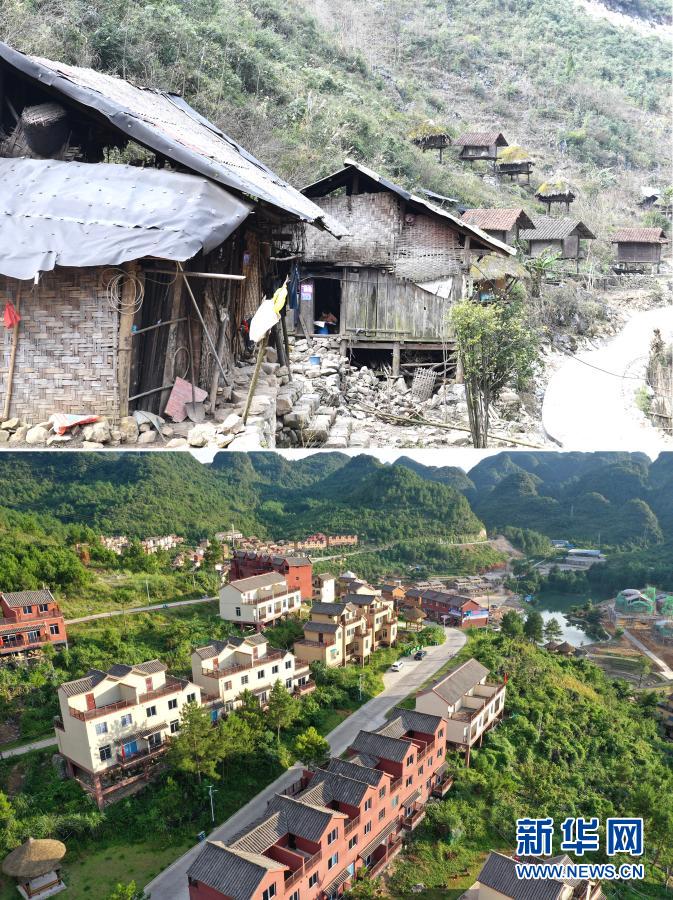 這是一張拼版照片。上圖:整屯搬遷前的廣西南丹縣里湖瑤族鄉(xiāng)董甲村么干屯(2018年1月10日攝)。這里的村民都搬遷到“千家瑤寨·萬戶瑤鄉(xiāng)”里湖王尚易地扶貧搬遷安置點(diǎn)。下圖:“千家瑤寨·萬戶瑤鄉(xiāng)”里湖王尚易地扶貧搬遷安置點(diǎn)(8月4日攝,無人機(jī)照片)。新華社記者 周華 攝