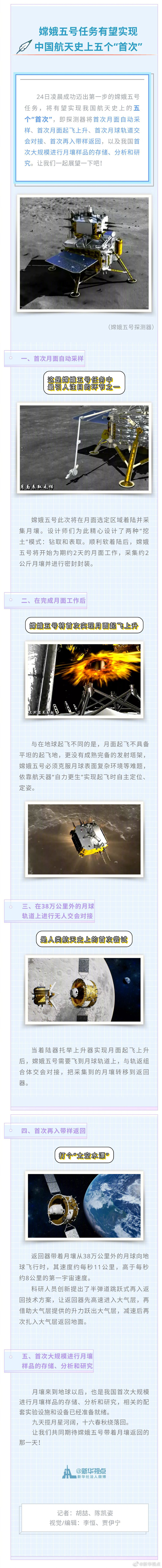 24日凌晨成功邁出第一步的嫦娥五號任務,將有望實現我國航天史上的五個“首次”。看詳情!一起來展望? ????