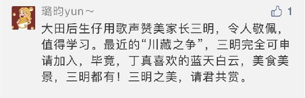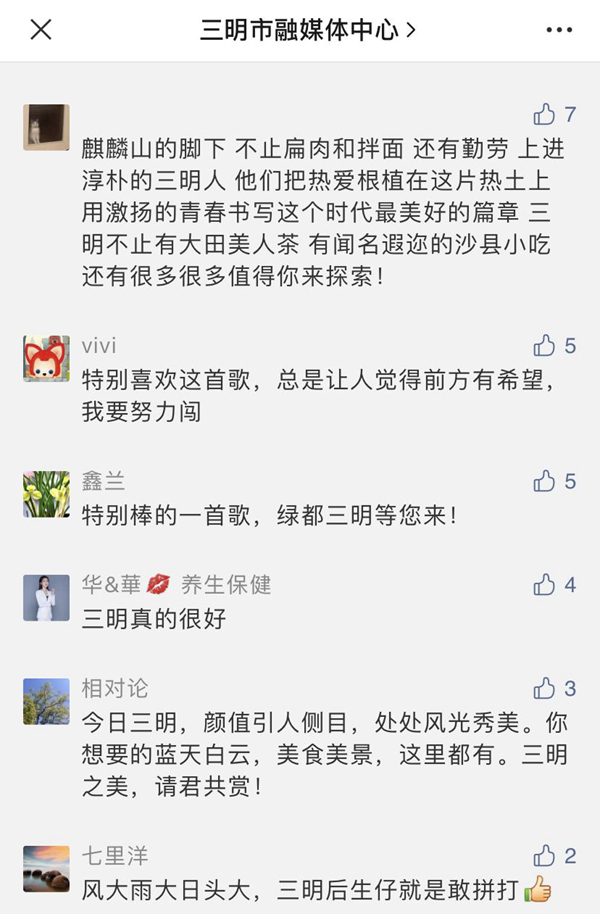 “我大福建真是處處美得沒話說!”“哈哈,我大沙縣又壓軸了?!薄疤寐犃?!內(nèi)心充滿自豪!”“開門見綠,抬頭見藍(lán),這就是我的家鄉(xiāng)?!边€有網(wǎng)友希望這首歌“能上春晚”。更有網(wǎng)友吟誦起三明,“好山好水好風(fēng)情,數(shù)一數(shù)二數(shù)三明。紅軍長征出發(fā)地,客家文化傳世界 …… ”