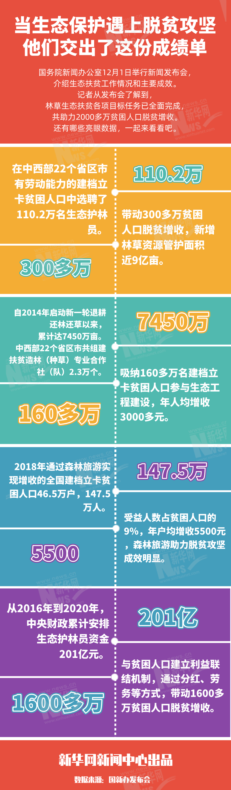 編輯: 汪亞 設(shè)計: 汪亞 2020年12月01日 13:52:14 來源: 新華網(wǎng)??? 國務(wù)院新聞辦公室12月1日舉行新聞發(fā)布會,介紹生態(tài)扶貧工作情況和主要成效。記者從發(fā)布會了解到,林草生態(tài)扶貧各項目標(biāo)任務(wù)已全面完成,共助力2000多萬貧困人口脫貧增收。還有哪些亮眼數(shù)據(jù),一起來看看吧。