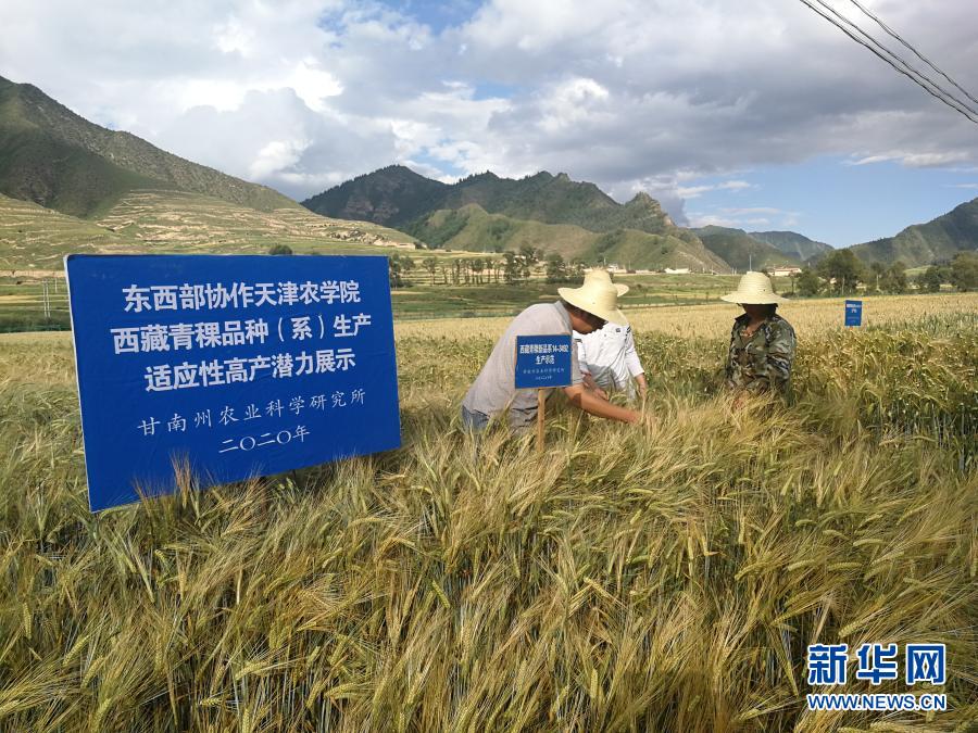 天津農學院種子科學與工程系主任趙飛(左)在甘肅省甘南州建成的青稞增產技術集成示范基地工作(8月5日攝)。新華社發