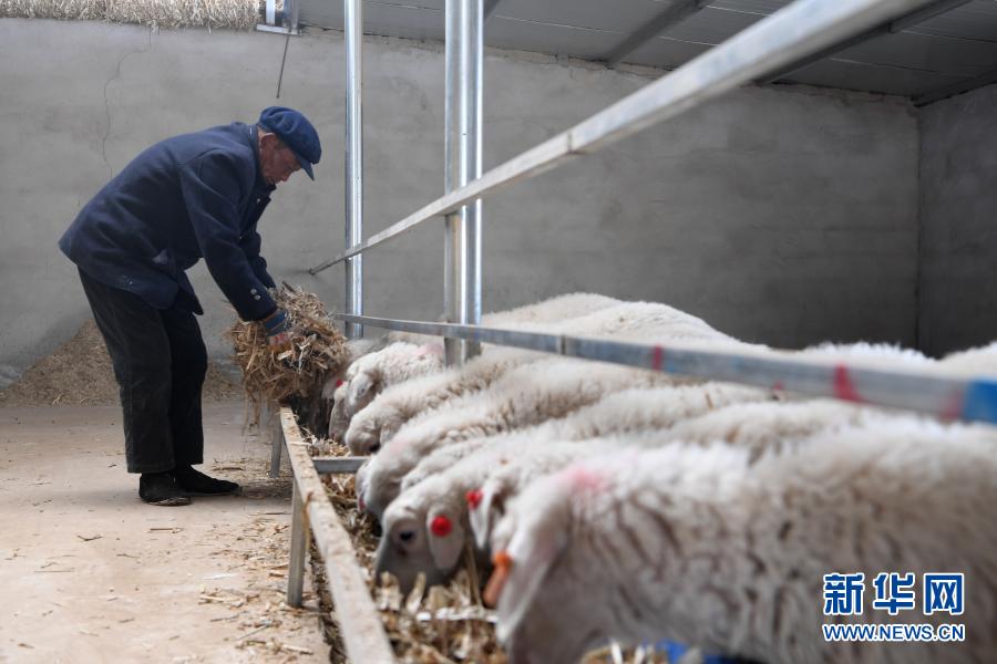 在古浪縣黃花灘生態(tài)移民區(qū)富民新村養(yǎng)殖小區(qū),村民李應(yīng)川在喂羊(3月10日攝)。新華社記者 范培珅 攝
