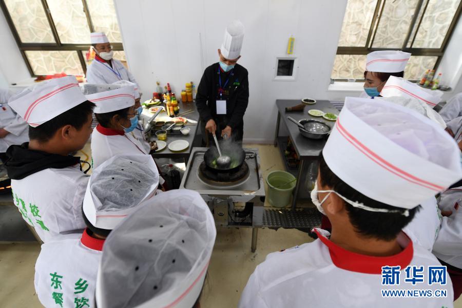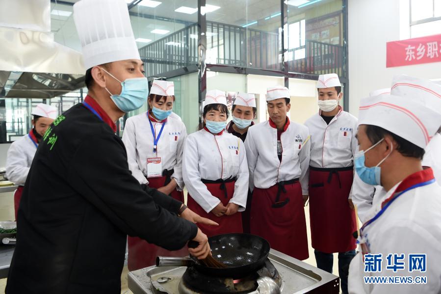 東鄉(xiāng)縣職業(yè)技術(shù)學(xué)校中式烹飪培訓(xùn)班學(xué)員在上實(shí)操課(4月21日攝)。新華社記者 范培珅 攝