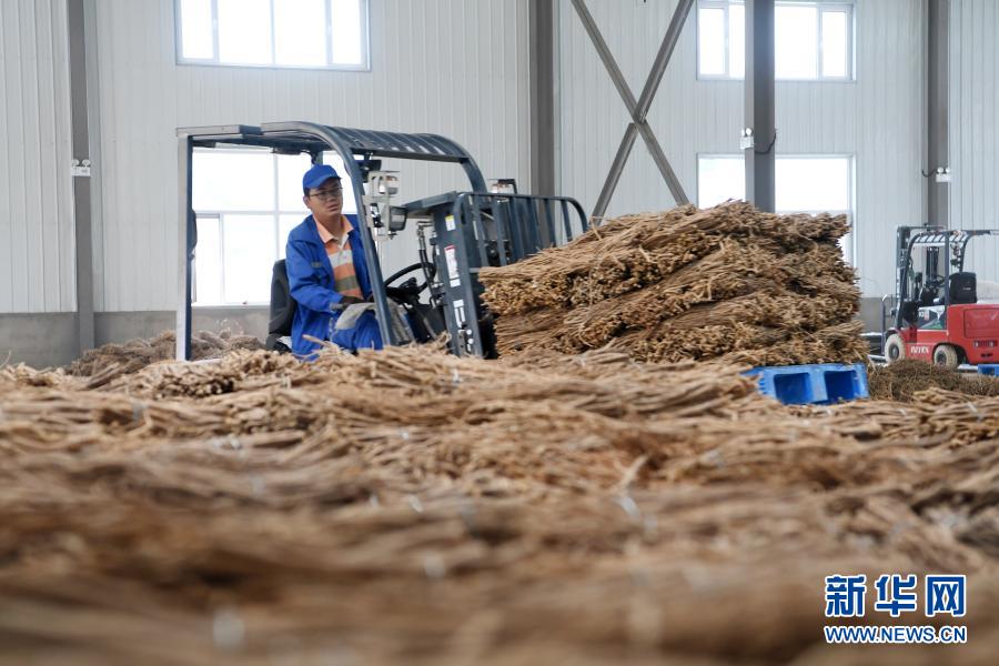 在宕昌縣哈達(dá)鋪琦昆現(xiàn)代中藥材倉(cāng)儲(chǔ)物流基地,工作人員使用叉車搬運(yùn)中藥材(9月18日攝)。新華社記者 范培珅 攝