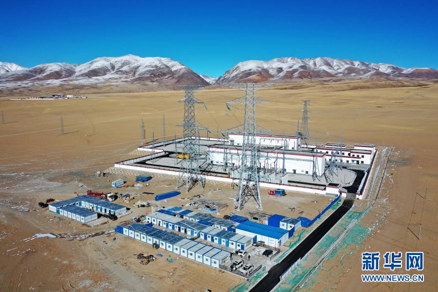 這是11月27日拍攝的西藏阿里與藏中電網(wǎng)聯(lián)網(wǎng)工程霍爾220千伏變電站(無人機照片)。新華社記者 詹彥 攝