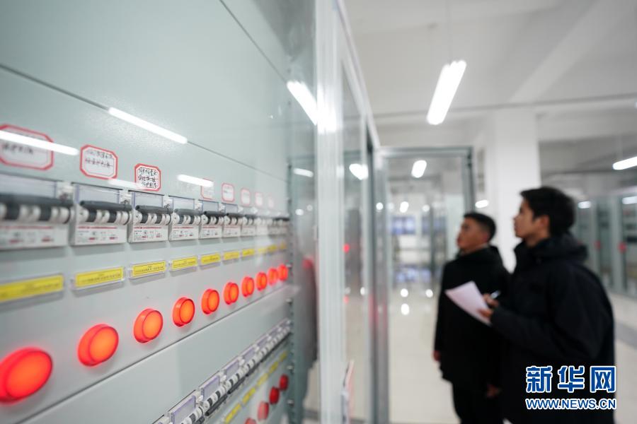 在西藏阿里與藏中電網(wǎng)聯(lián)網(wǎng)工程薩嘎220千伏變電站,工作人員查看設(shè)備運行情況(11月27日攝)。新華社記者 詹彥 攝
