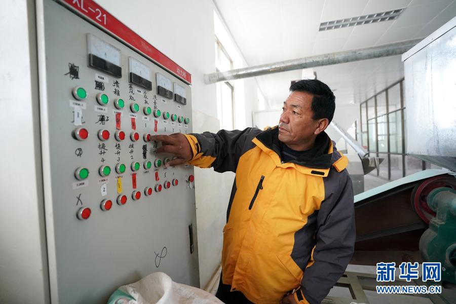 在西藏阿里地區(qū)普蘭縣普蘭西德稞原地食品有限公司,工作人員在糌粑加工車間查看設(shè)備運行情況(11月28日攝)。新華社記者 詹彥 攝