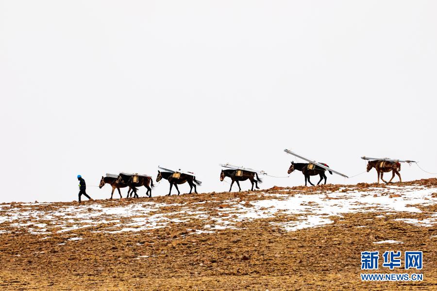 在西藏日喀則市拉孜縣與定日縣交界處的嘉措拉山上,施工人員用騾子向施工點運送材料(4月25日攝)。新華社發(fā)