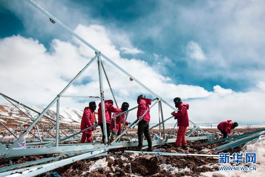 “施工人員服用保護心臟的藥,背著氧氣瓶上到山頂,工作時心跳一直保持在每分鐘120次以上,一個小時就得輪班下來。”譚晉說,山頂?shù)奶鞖庾兓脽o常,有時晴朗,強烈的紫外線照得大家滿臉?biāo)荩挥袝r一場大雪,有的工人會瞬間雪盲。