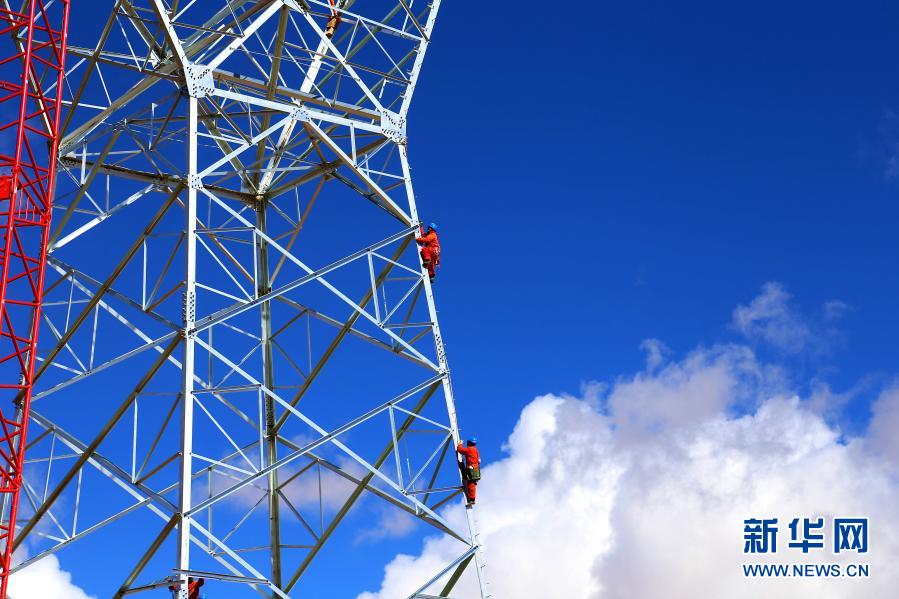 在西藏阿里地區(qū)噶爾縣,施工人員在西藏阿里與藏中電網(wǎng)聯(lián)網(wǎng)工程線路13標(biāo)段進行組塔作業(yè)(3月29日攝)。新華社發(fā)