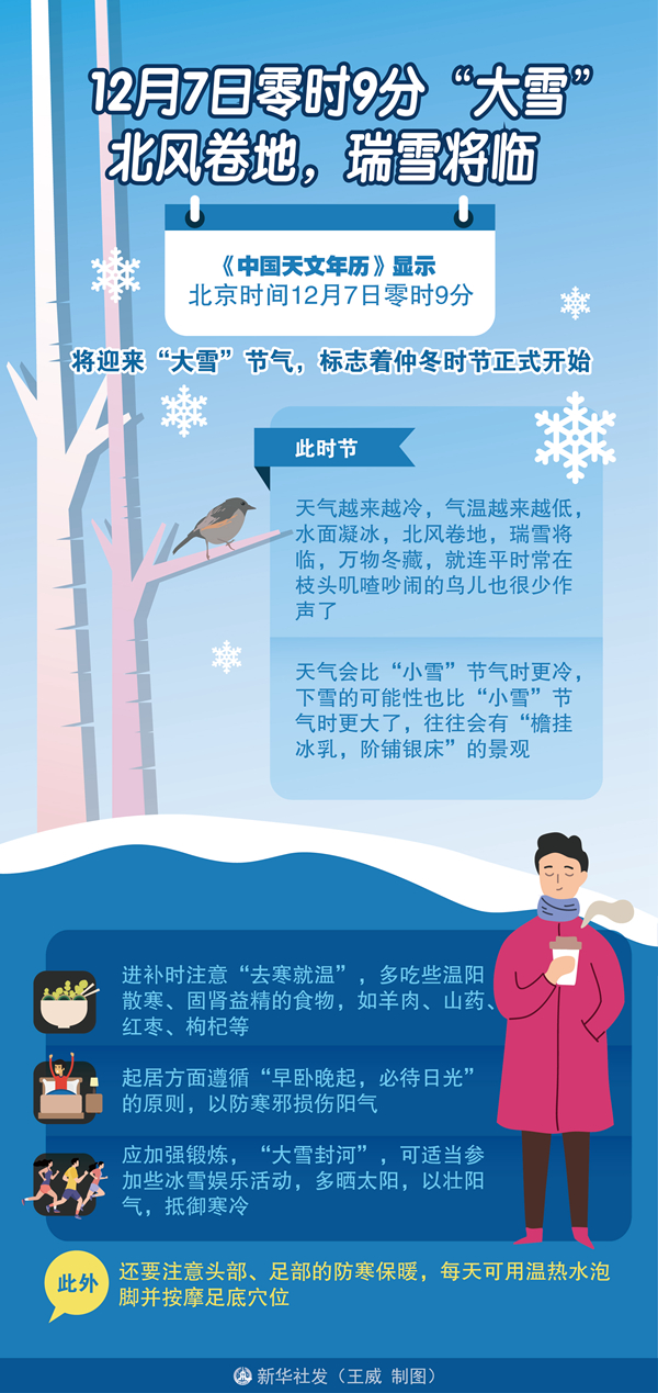 “大雪”時節(jié),陰氣最盛,但盛極而衰,陽氣有所萌動。羅澍偉建議公眾,進補時注意“去寒就溫”,多吃些溫陽散寒、固腎益精的食物,如羊肉、山藥、紅棗、枸杞等;起居方面,遵循“早臥晚起,必待日光”的原則,以防寒邪損傷陽氣。應加強鍛煉,“大雪封河”,可適當參加些冰雪娛樂活動,多曬太陽,以壯陽氣,抵御寒冷。此外,還要注意頭部、足部的防寒保暖,每天可用溫熱水泡腳并按摩足底穴位。