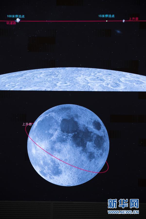 這是12月6日在北京航天飛行控制中心指揮大廳拍攝的嫦娥五號(hào)上升器與軌道器返回器組合體交會(huì)對(duì)接畫面。