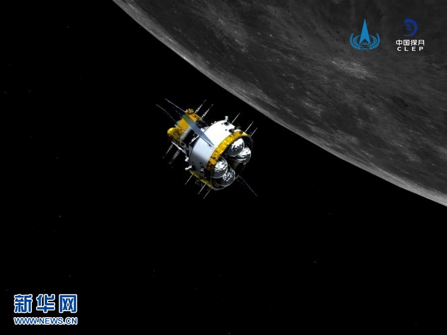軌返組合體與上升器分離前模擬圖。記者從國家航天局獲悉,北京時間12月6日12時35分,嫦娥五號軌道器返回器組合體與上升器成功分離,進入環月等待階段,準備擇機返回地球。新華社發(國家航天局供圖)