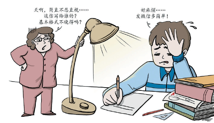 齊齊從小學(xué)一年級(jí)就開始練習(xí)毛筆字,如今已經(jīng)能寫出很不錯(cuò)的行書,但他也從不寫信,“有必要嗎?”齊齊說,父母要求他每個(gè)月要給遠(yuǎn)在老家的祖父母、外祖父母打電話,每次電話的通話時(shí)間也就兩三分鐘,“我爸他們也就是問奶奶吃飯了沒,多買點(diǎn)吃的,不舒服趕緊去醫(yī)院……就這幾句話,真沒營養(yǎng)。”