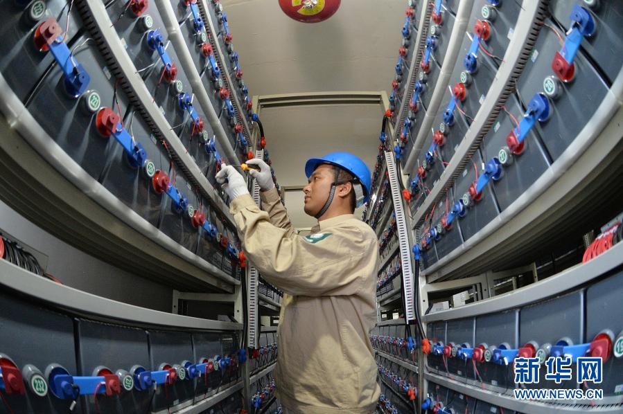 在江蘇省灌云縣開山島,國家電網的施工人員在調試“風光儲互補智能微電網系統”的蓄電池組(2019年6月18日攝)。新華社發(萬程鵬 攝)