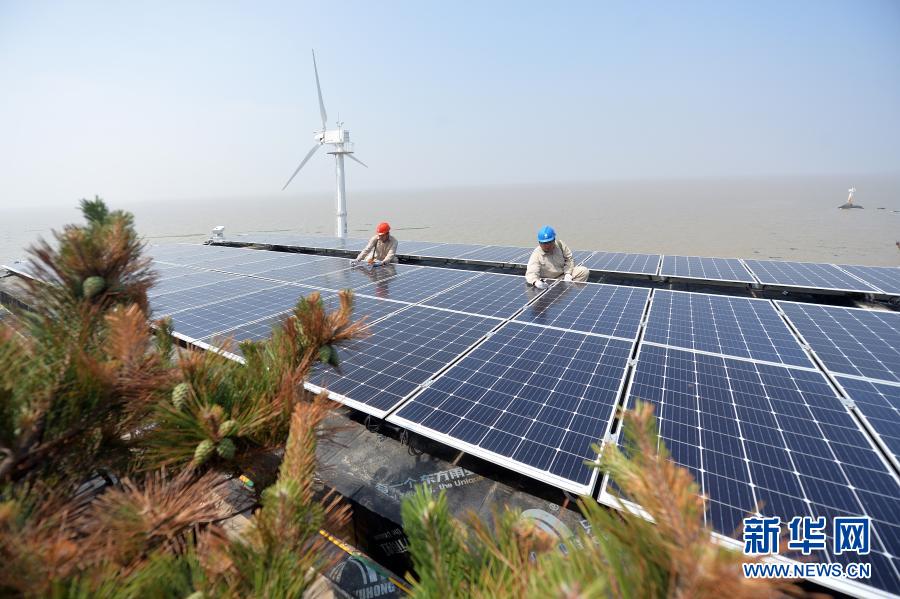 在江蘇省灌云縣開山島,國家電網的施工人員在屋頂上檢查光伏面板運行情況(2019年6月18日攝)。新華社發(萬程鵬 攝)