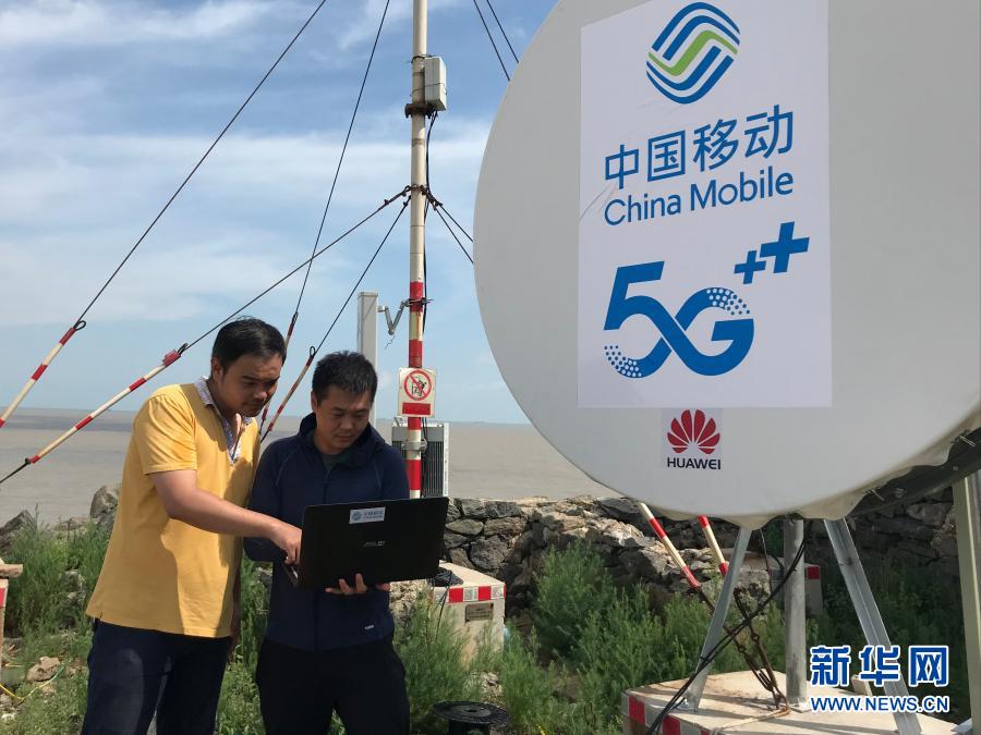 在江蘇省灌云縣開山島,中國移動工作人員測試5G信號(5月20日攝)。新華社發(茆平平 攝)